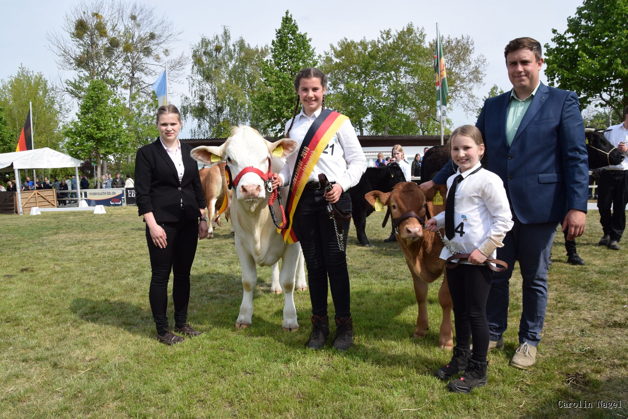 Am Samstag, den 11. Mai ging es schon um 9 Uhr mit dem Vorführwettbewerb los. Nachdem die zwei vierjährigen Bambinos des Brandenburger Jungzüchtervereins den Jungzüchtertag mit ihrer Vorführleistung eröffneten, begann bei leichtem Sonnenschein der spannende Wettbewerb. In der Altersklasse Jung hatten die Preisrichter Jessica Pionke (RinderAllianz, Sachsen Anhalt) und Johannes Bock (Jüngzüchtervorstand, Hessen) sechs Klassen zu richten. Keine leichte Aufgabe, denn schon die jüngsten Jungzüchter im Alter von 7 –bis 14 Jahren präsentierten ihre Tiere professionell und wussten genau, worauf es ankommt. Schließlich setzte sich in der Siegerauswahl Jung Anna Sophie Neitzel aus Sachsen-Anhalt vor Lina Schmidt aus Sachsen durch.