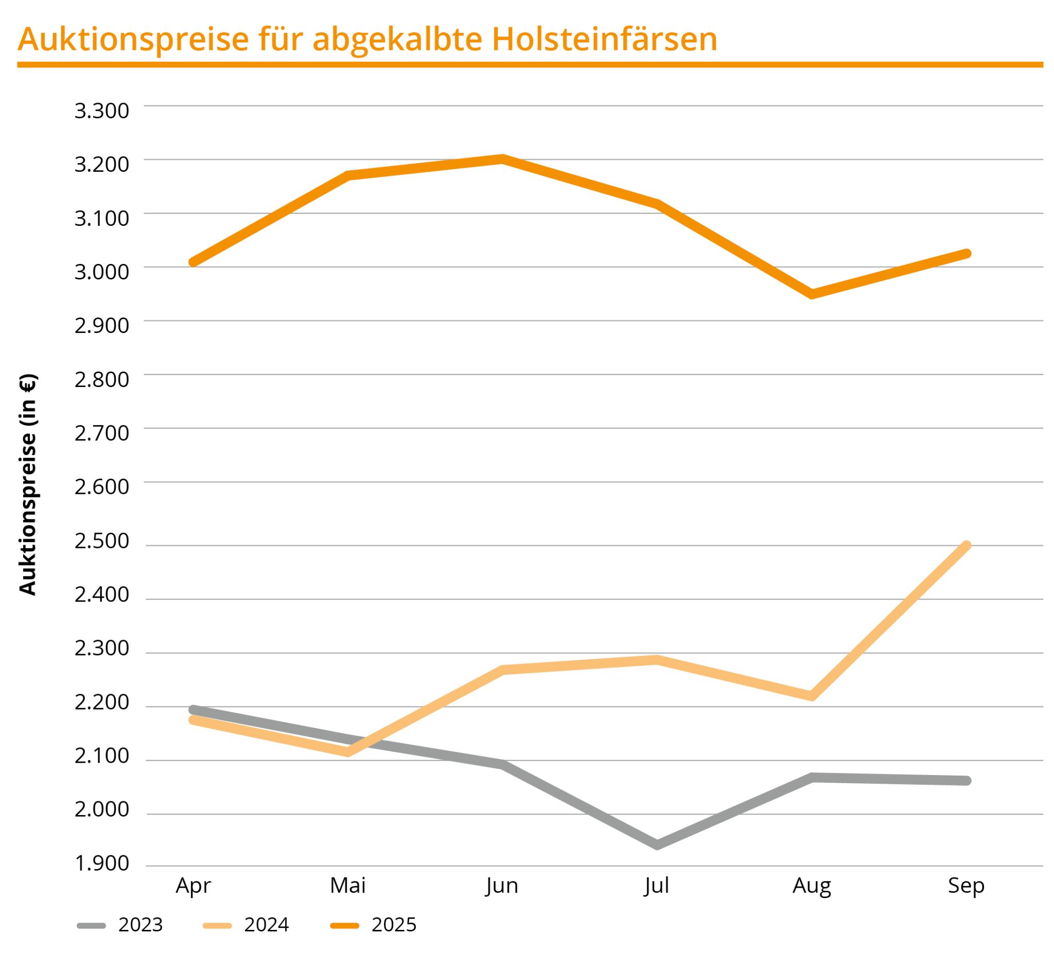 Auch im dritten Quartal 2025 bleiben die Preise auf den Zuchtviehauktionen auf hohem Niveau. Besonders im Juli wurden bei den geringsten Stückzahlen die höchsten Durchschnittspreise erzielt – Färsen erzielten im Schnitt 3.117 Euro, während der August mit 2.949 Euro etwas schwächer ausfiel.