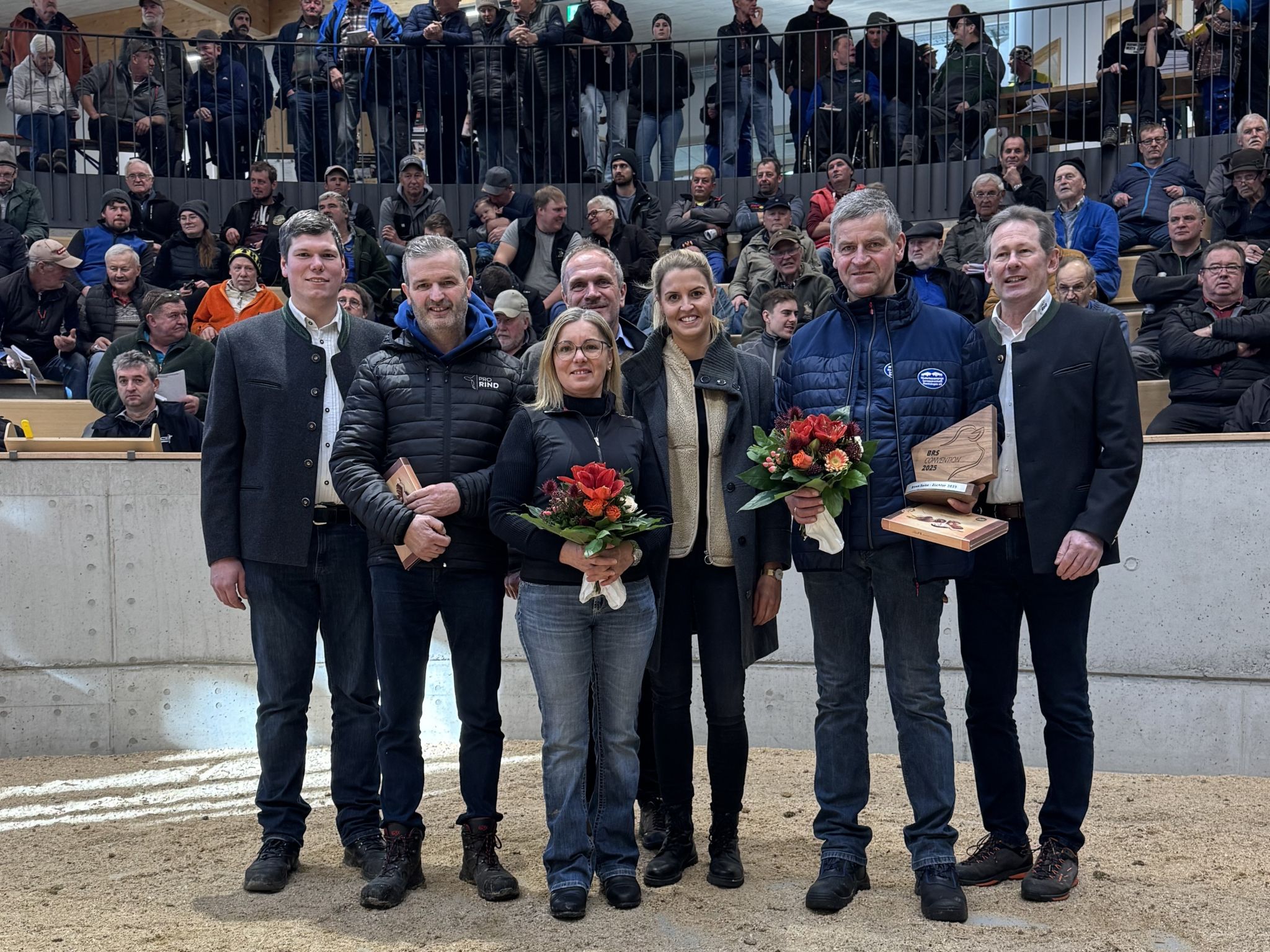 Die Auszeichnung für den allerersten Brown Swiss-Züchter des Jahres geht in diesem Jahr an den Familienbetrieb Martin Schlecker aus Neu-Ulm. Martin Schlecker melkt rund 240 Braunviehkühe mit einer durchschnittlichen Leistung von 10.747 kg Milch mit 4,65% Fett und 3,73% Eiweiß. Im vergangenen Jahr haben gleich sechs Kühe die beeindruckende Marke von 100.000 kg Milch überschritten, während weitere 26 Kühe eine Lebensleistung von über 70.000 kg Milch aufweisen. Außerdem stammen vier aktuelle Besamungsbullen aus der Zucht von Martin Schlecker, der über die Auktionen von ProRind jährlich zahlreiche Zuchttiere verkauft. So haben der BRS und die ASR Martin Schlecker auf der letzten Auktion des Jahres, der Weihnachtsauktion in Unterthingau, persönlich getroffen und durften den Award in einer tollen Züchter-Atmosphäre gemeinsam mit Zuchtleiter Dr. Franz Birkenmaier sowie Norbert Meggle und Thomas Bechteler von ProRind überreichen.